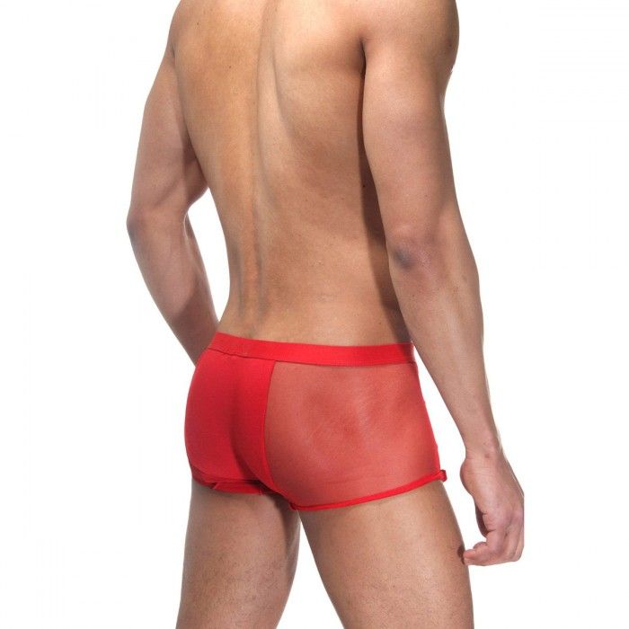 Красные гладкие трусы-боксеры для мужчин. Резинка у трусов широкая, по бокам полупрозрачные вставки.