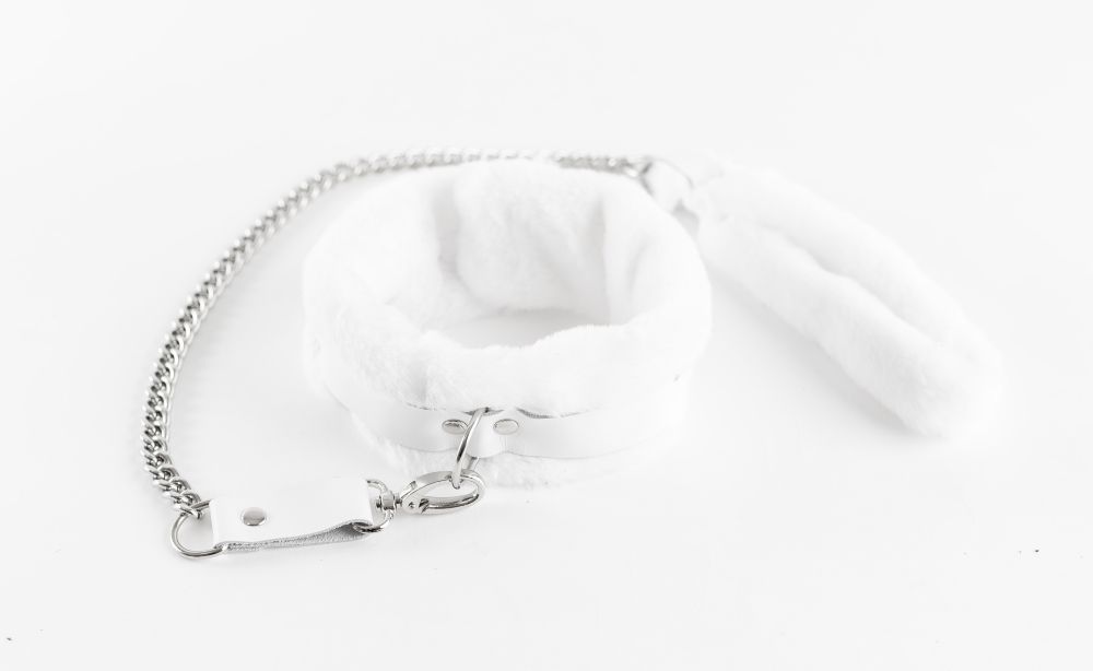 Комплект аксессуаров из ошейника и поводка. Ремешки выполнены из натуральной кожи белого цвета. Нежнейший мех максимально приятен к телу. Размер регулируется. Ошейник с поводком упакованы в подарочный пакет. Ширина - 6 см. Обхват - 33-45 см. Длина поводка - 70 см.