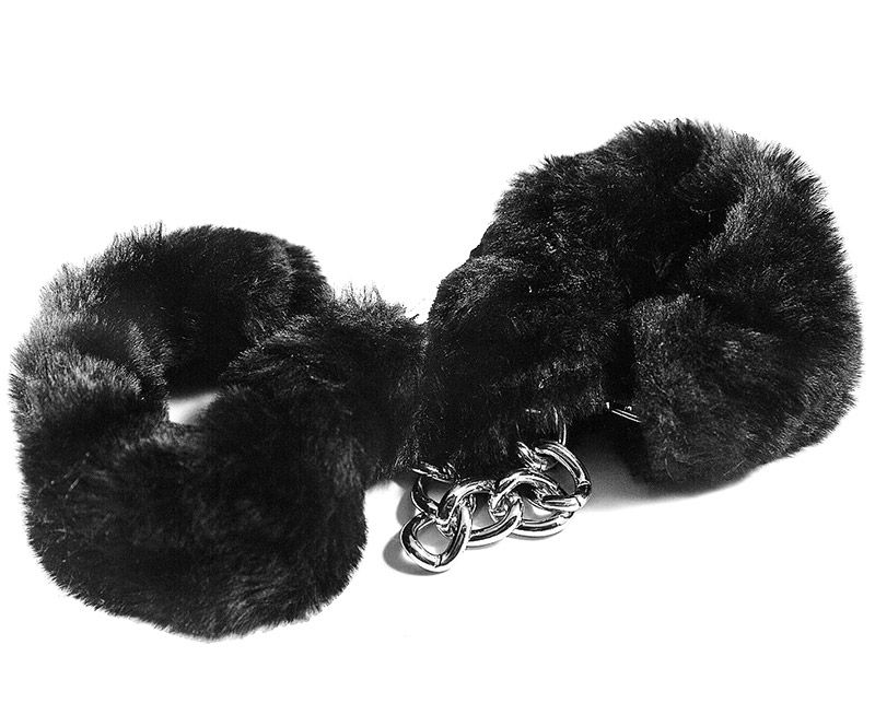 Наручники на металлической регулируемой сцепке. Декорированы в нежный искусственный мех для более комфортного использования. Размер регулируется карабином.